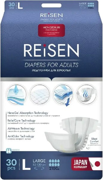 Подгузники REISEN L предназначены для взрослых и малоподвижных людей со средней и тяжелой степенью недержания. Впитываемость до 2100 мл.