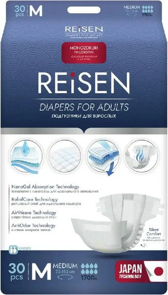 Подгузники REISEN M предназначены для взрослых и малоподвижных людей со средней и тяжелой степенью недержания. Впитываемость до 1700 мл.