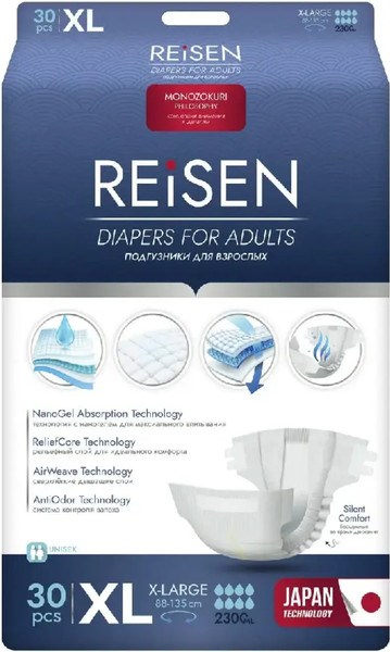 Подгузники REISEN XL предназначены для взрослых и малоподвижных людей со средней и тяжелой степенью недержания. Впитываемость до 2300 мл.