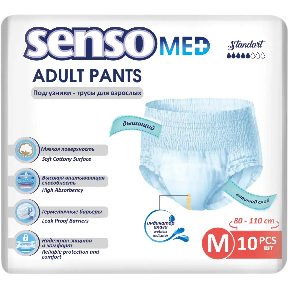 Трусики впитывающие для взрослых SENSO MED Standart 2 Medium 80-110 см предназначены для использования в санитарно-гигиенических целях. Изделие одноразового использования. Подходит для людей с недержанием мочи и невозможностью управлять мочеиспусканием. Внутренняя мягкая поверхность быстро пропускает влагу внутрь. Средний слой обладает высокой впитывающей способностью благодаря суперабсорбенту. Влага быстро распределяется и надежно удерживается. Дышащий внешний слой избавляет от парникового эффекта, кожа проветривается. Эластичный пояс обеспечивает плотную посадку на пояснице. Герметичные защитные барьеры вокруг ног предотвращают протекание.